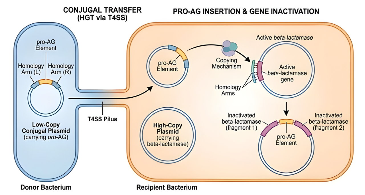 Enter 2026 en een verbeterd prototype ziet het licht. De onderzoekers breiden de genetische cassette uit met extra machinerie. Die stelt de bacteriecel nu ook in staat om haar eigen verworven, slimme genetische cassette door te geven aan niet-dochtercellen, zeg maar aan broers of zussen (of verre neven en nichten) – niet enkel aan nakomelingen. Dat noemt men horizontale gentransfer. Het verloopt via een ‘tunnel’ tussen twee bacteriën, een fenomeen dat bekend staat als ‘conjugatie’.
